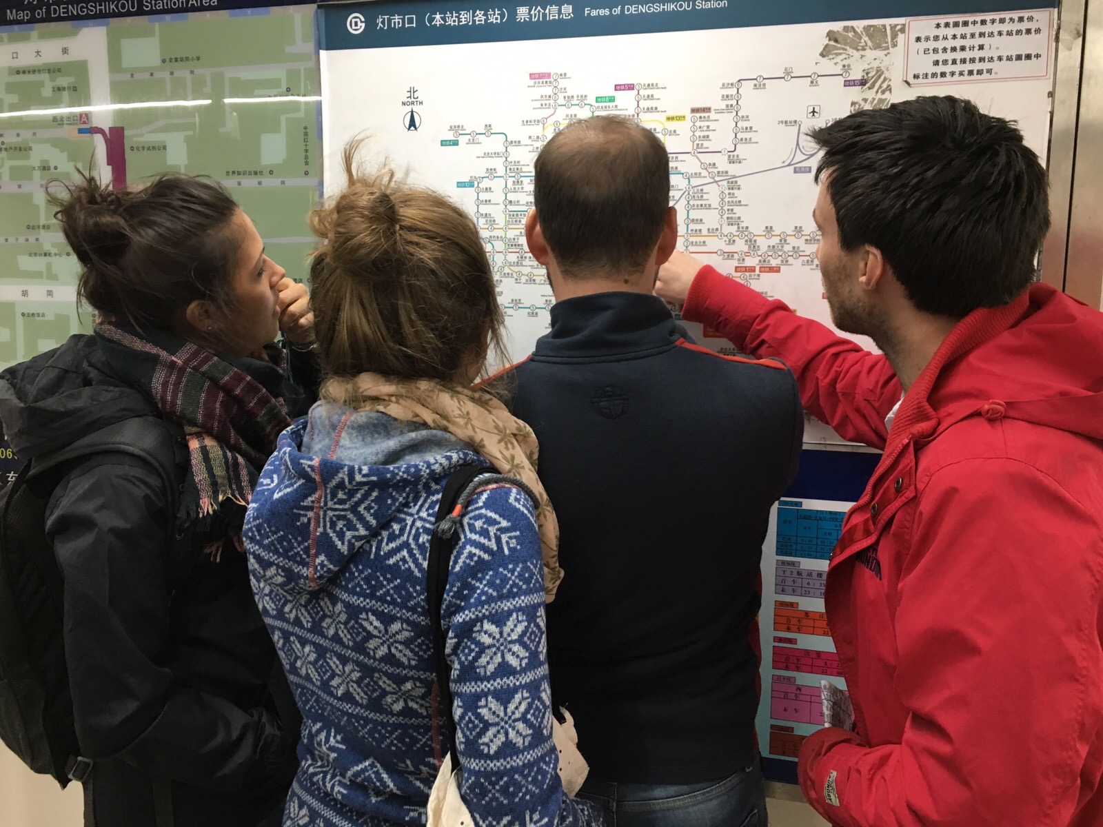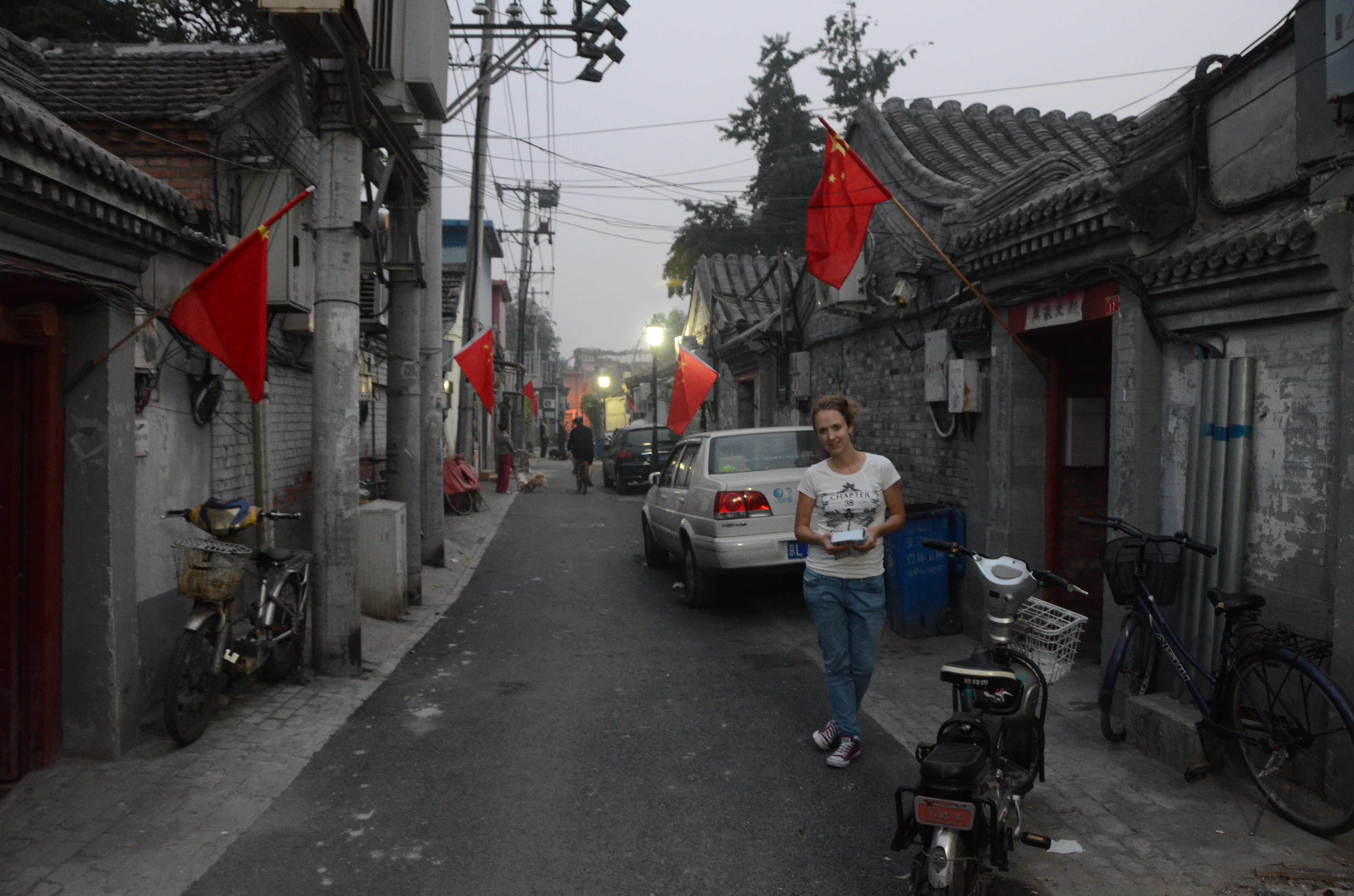 In een donkergrijze nacht kwamen we aan in Beijing. Na een vlekkeloze vlucht werden we, na een rit door rood neon-verlicht Beijing, om 1.30u ’s nachts afgezet in een donker straatje achter een tempelboog. Na (waarschijnlijk) een Chinese succeswens was de chauffeur terstond verdwenen en restte ons heel veel onbegrijpelijke, onverlichte Chinese tekens op muren. Godzijdank troffen we meteen de Chinese gastvrijheid in een koopman op een elektrische bakfiets met zijn straateten. Op weg naar huis. Met handen en voeten en druk wijzend op de Chinese teksten in onze Lonely Planet kwamen we dan toch aan bij ons bloem- en plantrijke hostel. Missie 1 geslaagd.