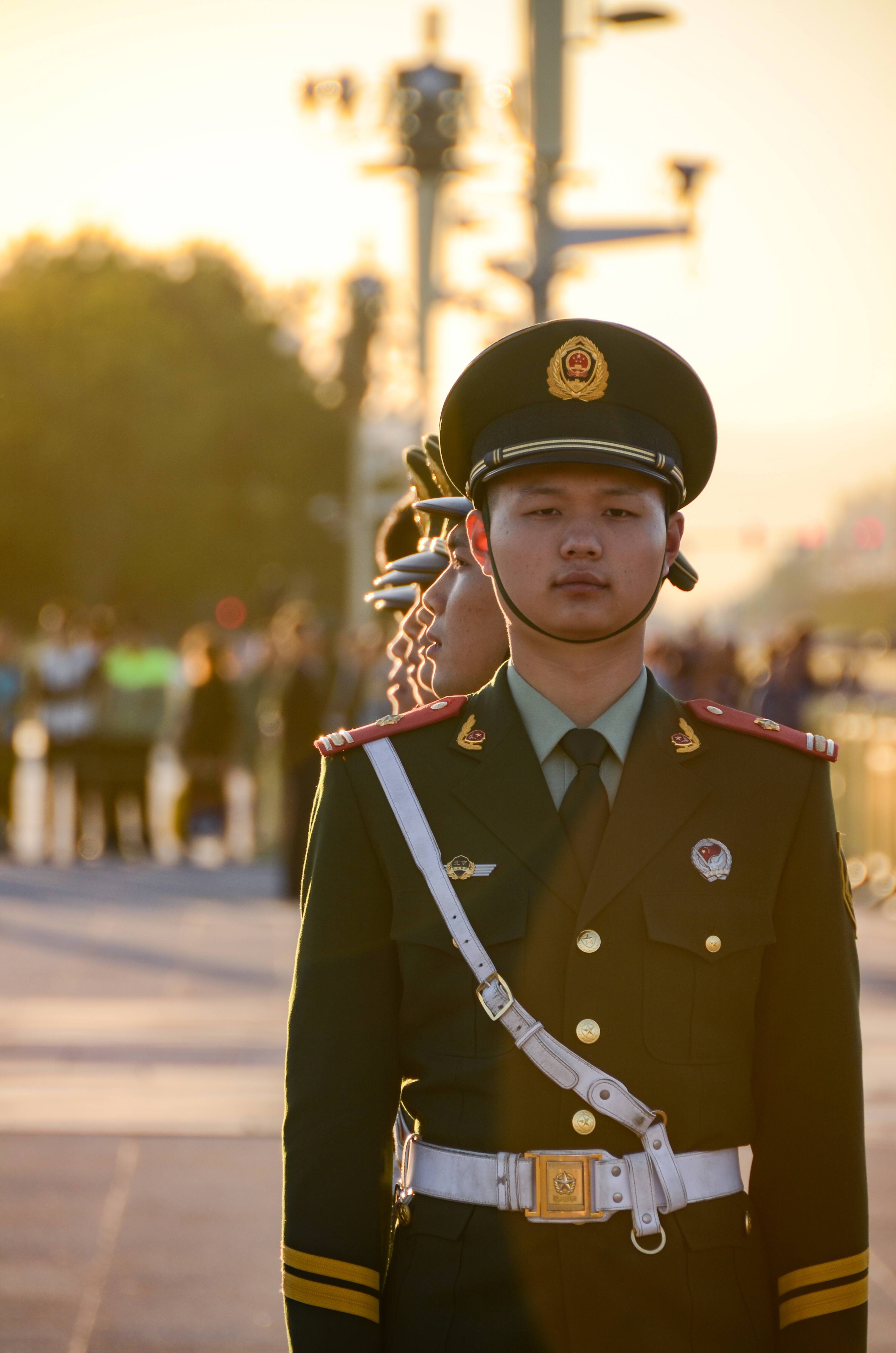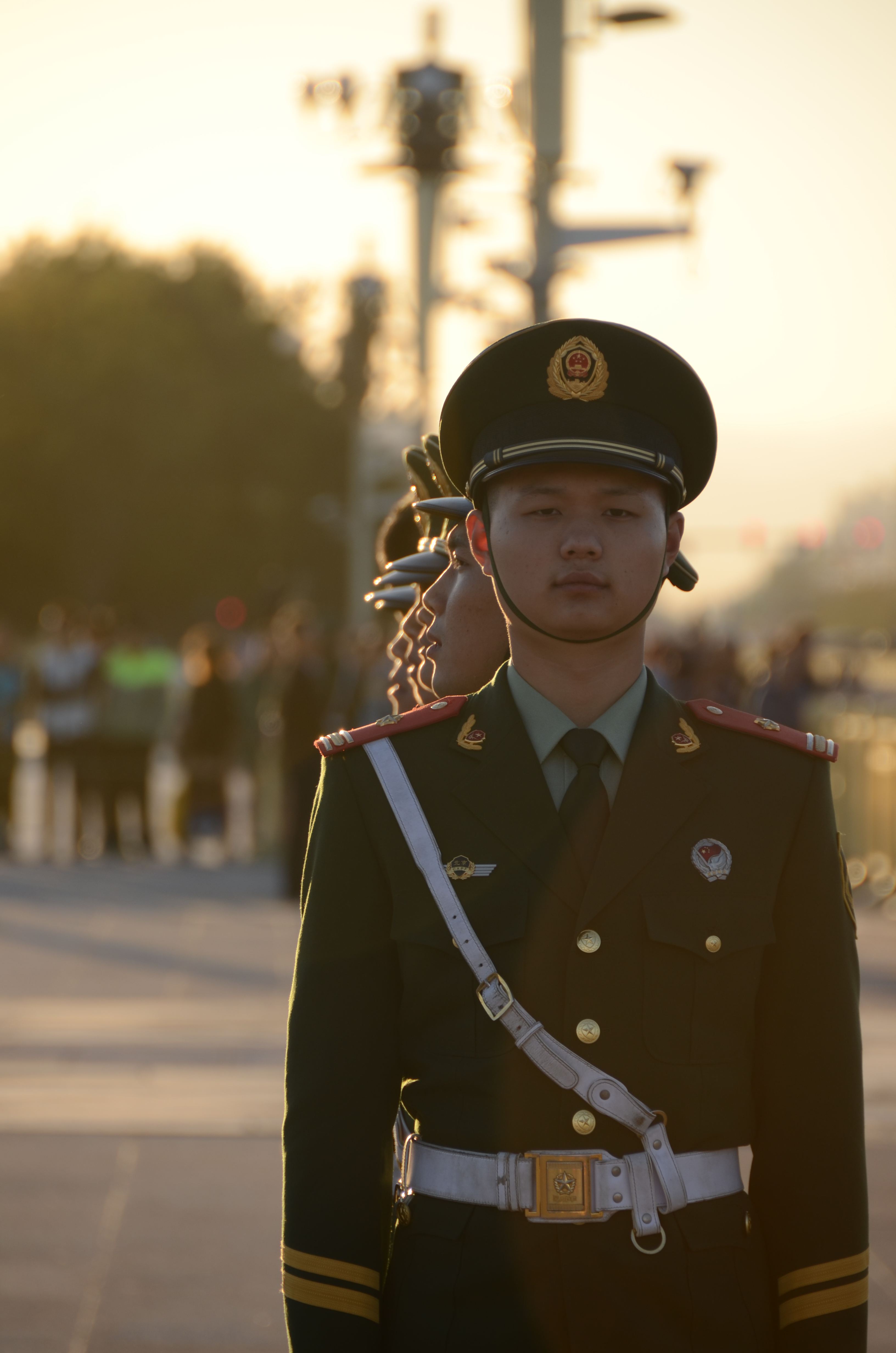 De zon daalde en liet haar lage licht over de gezichten van de marcherende wachten vallen. Jongens van amper 18 jaar oud met te grote communistische militaire petten op. Afgewisseld door jongens van een soort geheime dienst. In zwarte pakken, zwarte zonnebrillen en een wit blousje. Krampachtig proberen de passen van 75cm in acht te nemen. Het plein is omgeven door gigantische Chinese overheidsgebouwen waar veel van te vinden is. Grote rode letters op de gevels wat zo’n beetje het enige zegt over wat er achter de façades zich afspeelt. Imposant maar ook ontastbaar. Met het wakende oog van Mao Zedong vanuit zijn Mausoleum over het plein met haar bewogen verleden.