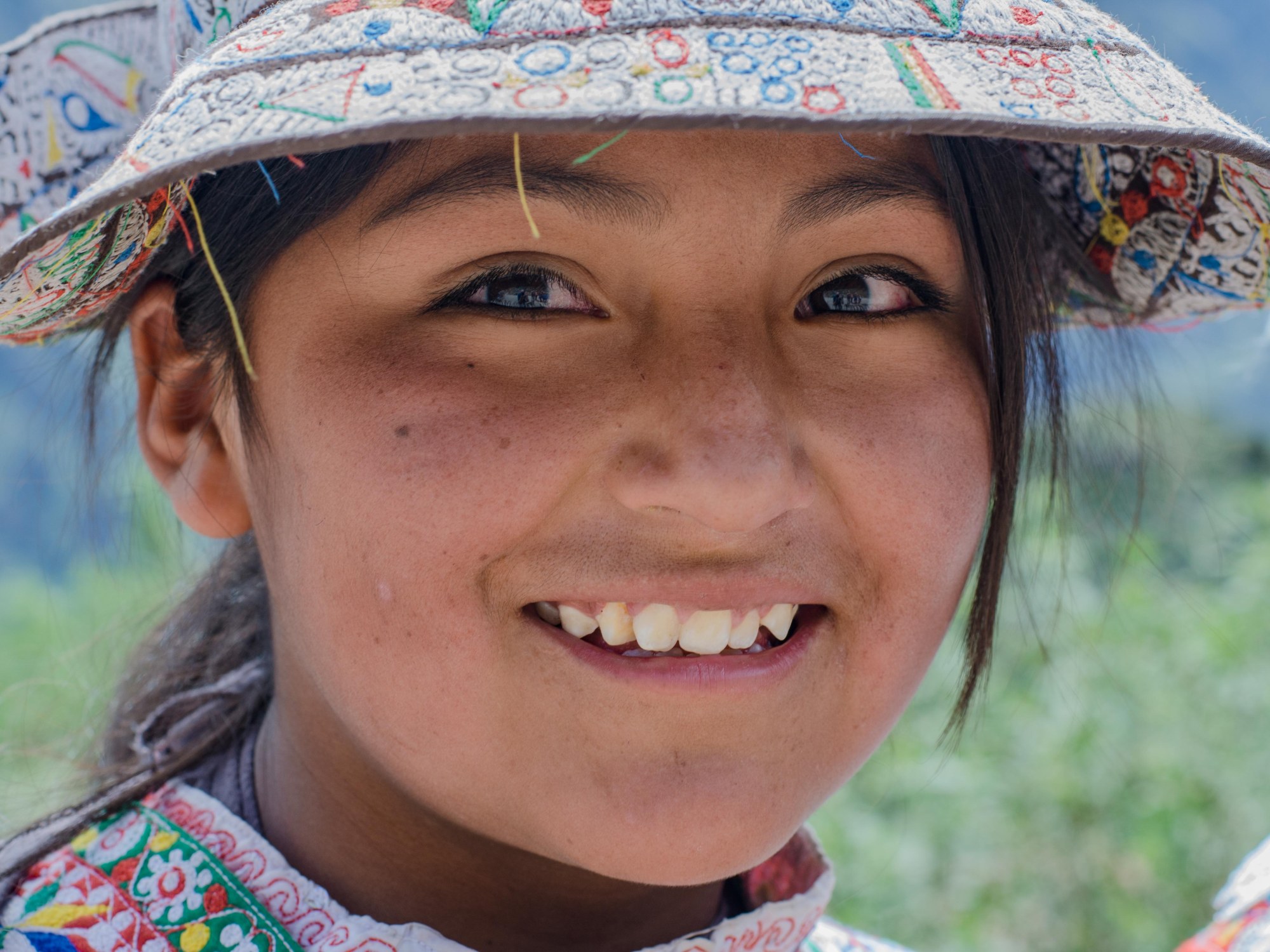 Na een kop Mate de Coca (tegen hoogteziekte) reden we verder richting de Pata Pampa (Pata=hoog, Pampa=land). Op een hoogte van 4820 meter liepen we rond in de dunne lucht. Het kleinste klimmetje omhoog veroorzaakte al heel wat puffen en steunen. De hoogte zorgt er ook voor dat je veel moet plassen. Een klein houten hutje van 1,5 meter hoog met een gat in de grond en zonder deur deed dienst als publiek toilet. Er ontstond een onwennige situatie waarbij veel toeristen giechelend op het toilet zaten, verscholen achter de benen van hun partner. We reden door richting Chivay. In een van de bochten voor het dorp vonden we een groepje dames die hun koopwaar hadden uitgestald. Niet zozeer de koopwaar als wel de meiden die hier tussen zaten zagen er mooi uit in hun witte jurken. Klassieke fijne Peruaanse gezichten die reeds waren geraakt en verhard door de felle hoogte zon.